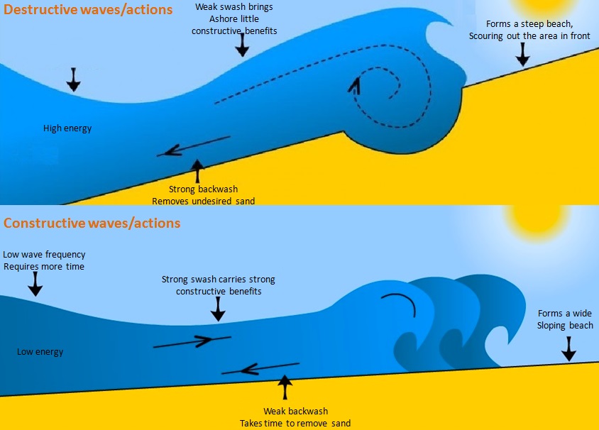 Constructive waves carries strong swash and have low energy. These actions requires more time to be put in place and space in the beach to let the sand there.