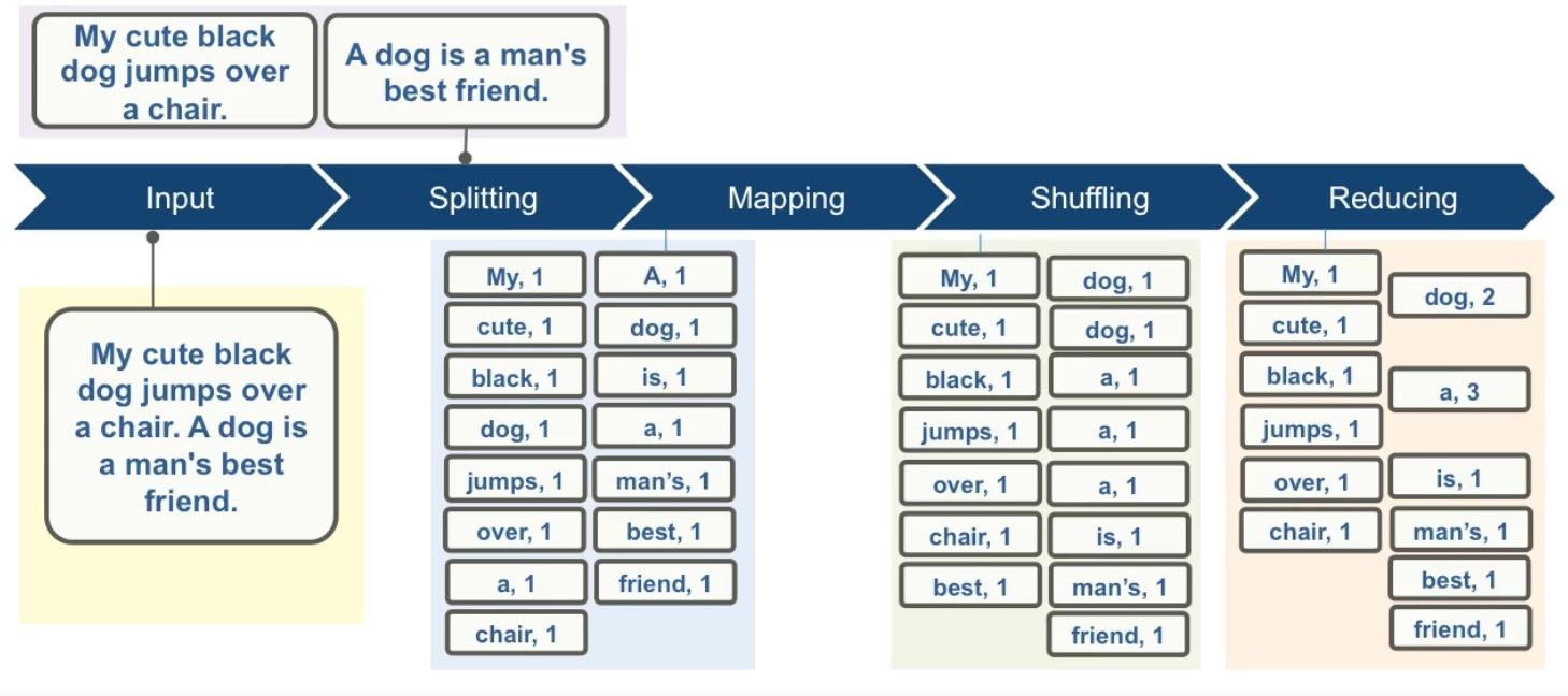 The sequence of steps is clear: input, splitting, mapping, shuffling and reducing.