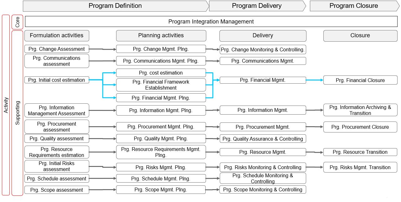 The program activities enable a strategic approach to planning, monitoring and controlling, and delivering program outputs and benefits. Program management supporting activities require coordination with functional groups in the organization— but in a broader context than similar activities supporting a single project.