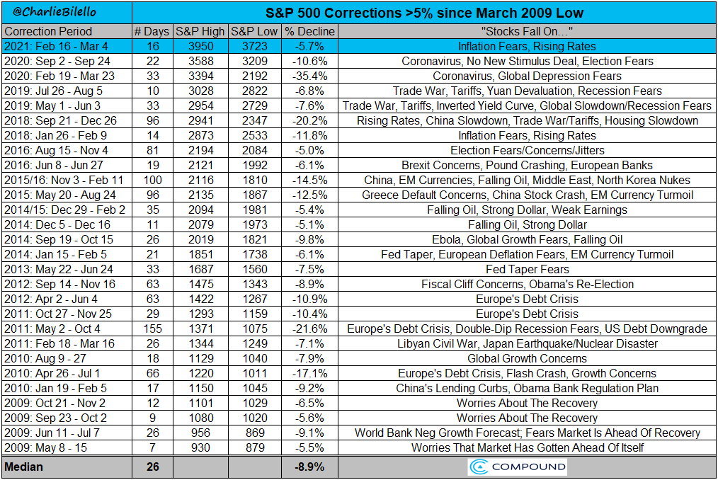 Esta tabla publicada por Charlie Bilello muestra todas las correcciones de más de un 5% desde Marzo de 2009 que fue el punto más bajo del S&P 500 durante la crisis que comenzó en 2008.