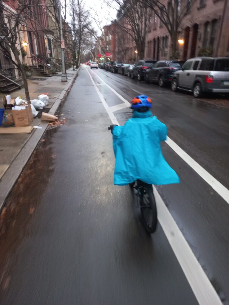 Riding to school, with some snowflakes