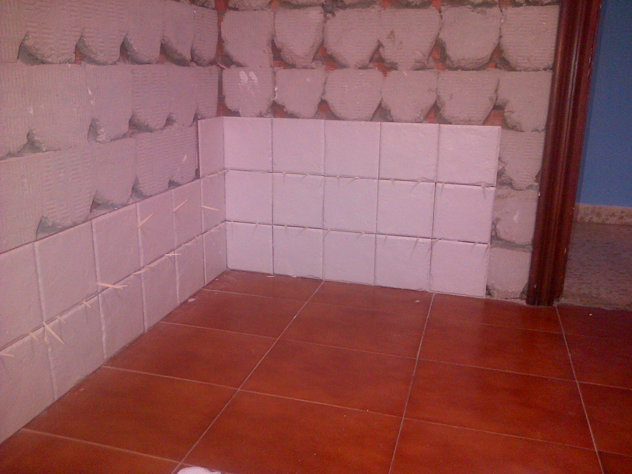 Tiles on the wall November 24, 2014April 16, 2014 by joapen First line is a little bit slow, but when you understand they will not fail, you do quicker and quicker… Toothpicks is the typical way to separate the tiles with a small separation.