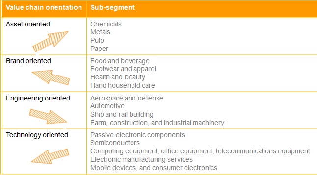 • Asset – oriented value chains are characterized by large investments in property, plant, and equipment and are dealing with modest levels of variation in supply, manufacturing, and demand.