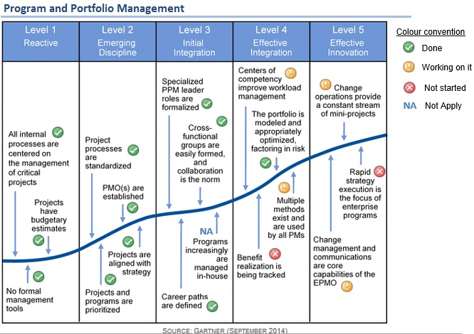 We started an improvement plan to evolve about these capabilities and our organization itself and we used Gartner “PPM Maturity Model” as guidelines of the actions we should perform to mature our PPM engagement with the rest of the organization. The methodology we have use to work on this has been Lean Six Sigma approach.