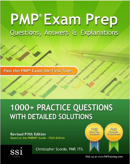PMP Exam Prep Questions, Answers, & Explanations: 1000+ PMP Practice Questions with Detailed Solutions by Christopher Scordo (4-Nov-2009)– 1600 questions by Christopher Scordo.