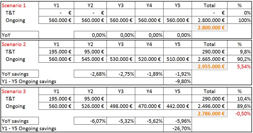 - Scenario 3: T&T with 10% on 5 years contract with a more agressive YoY reduction.