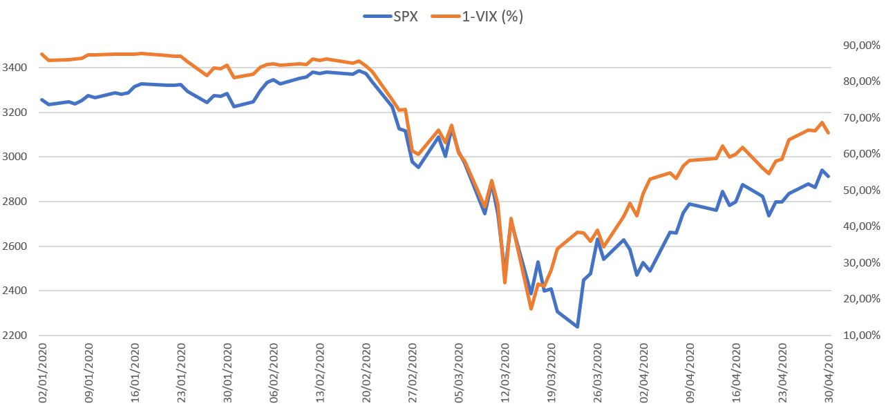 I added Volatility Index (^VIX) to a chart, but the figure was so bad. I did “1 minus VIX” and added to the chart, so you can see what happened: