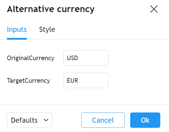 exchange = security(OriginalCurrency + TargetCurrency,timeframe.period,close) //Retrieves last close of the exchange