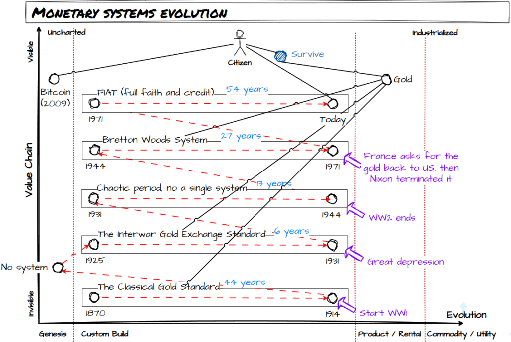 These systems were abandoned due to certain events (mainly major wars and depression), and then a new prevalent system emerges.