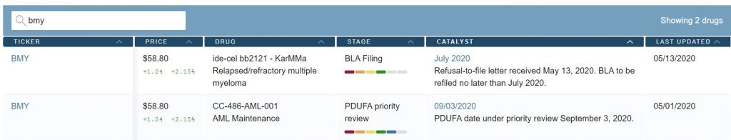 2.- Puedes mirar el calendario y buscar noticias recientes de productos relativos a una empresa concreta. En este caso miré Bristol Myers Squibb: