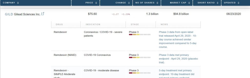 El resultado, da empresa por empresa los productos relacionados con esta enfermedad. Por ejemplo visualizo Gilead que es de las empresas que más avanzado tiene este fámaco (23/Junio/2020):