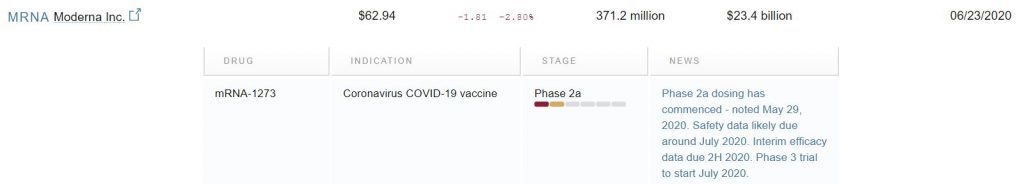 Hace unas semanas, la empresa Moderna subió en bolsa de una manera espectacular, el motivo la aprobación de una fase de un fármaco. Aquí podemos ver que solo es fase 2a, y que aun queda mucho tiempo para que esta empresa comience a hacer dinero con este producto:
