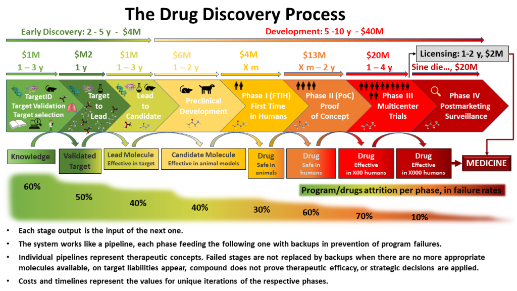 La foto de arriba sintetiza el proceso y añade algunas cifras en términos de tiempo e inversión que el desarrollo de un fármaco puede llegar a suponer. Estos dos datos son muy relevantes, especialmente para entender el gasto en I+D y los ciclos de financiación de las pequeñas empresas farmaceúticas.