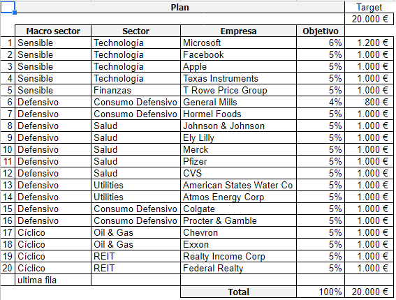 | «Es que ahora no soy capaz de definir 20 empresas para una cartera» | Pues no lo hagas, ve definiendo la cartera conforme vayas analizando y clasificando empresas, nadie te impide ir poniendo algunos cimientos a la cartera e ir comprando empresas. Otra cosas que puedes hacer es dejar una línea para una próxima empresa defensiva, que no sabes cual es, pero que en el equilibrio de macro-sector, quieres poder tener. |